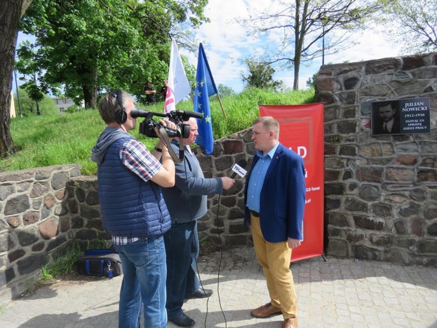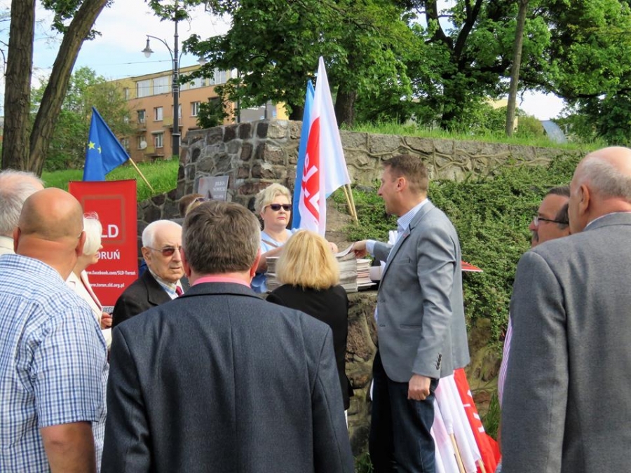 Tradycyjnie z okazji Święta Pracy w Toruniu odbył się dzisiaj okolicznościowy wiec. W miejscu gdzie do niedawna wisiała tablica upamiętniająca Juliana Nowickiego zebrani wysłuchali okolicznościowych przemówień. Podkreślano w nich głównie obecną sytuację, w której znaleźli się emerytowani funkcjonariusze służb mundurowych oraz nauczyciele po reformie oświaty. Poruszano także kwestie praw kobiet i godnego funkcjonowania osób niepełnosprawnych oraz ich rodzin. Na zakończenie podkreślono wartości, którymi kieruje się dzisiejsza lewica, a które to są zbieżne z tymi, będącymi fundamentem zjednoczonej Europy. Dziękujemy wszystkim za przybycie. Członkom i sympatykom SLD, przedstawicielom służb mundurowych i wojska, delegacji ZNP oraz środowisk broniących praw kobiet. Przede wszystkim jednak, dziękujemy przybyłym mieszkańcom Torunia, którzy mimo dzielących nas różnic przybyli by wspólnie domagać się poszanowania godności, praw pracowniczych i praw człowieka z prawami kobiet i osób niepełnosprawnych w szczególności. Dziękujemy, w imieniu organizatorów - szef SLD w Toruniu i powiecie toruńskom Marek Jopp. Zdjęcia - Dawid Podlewski.